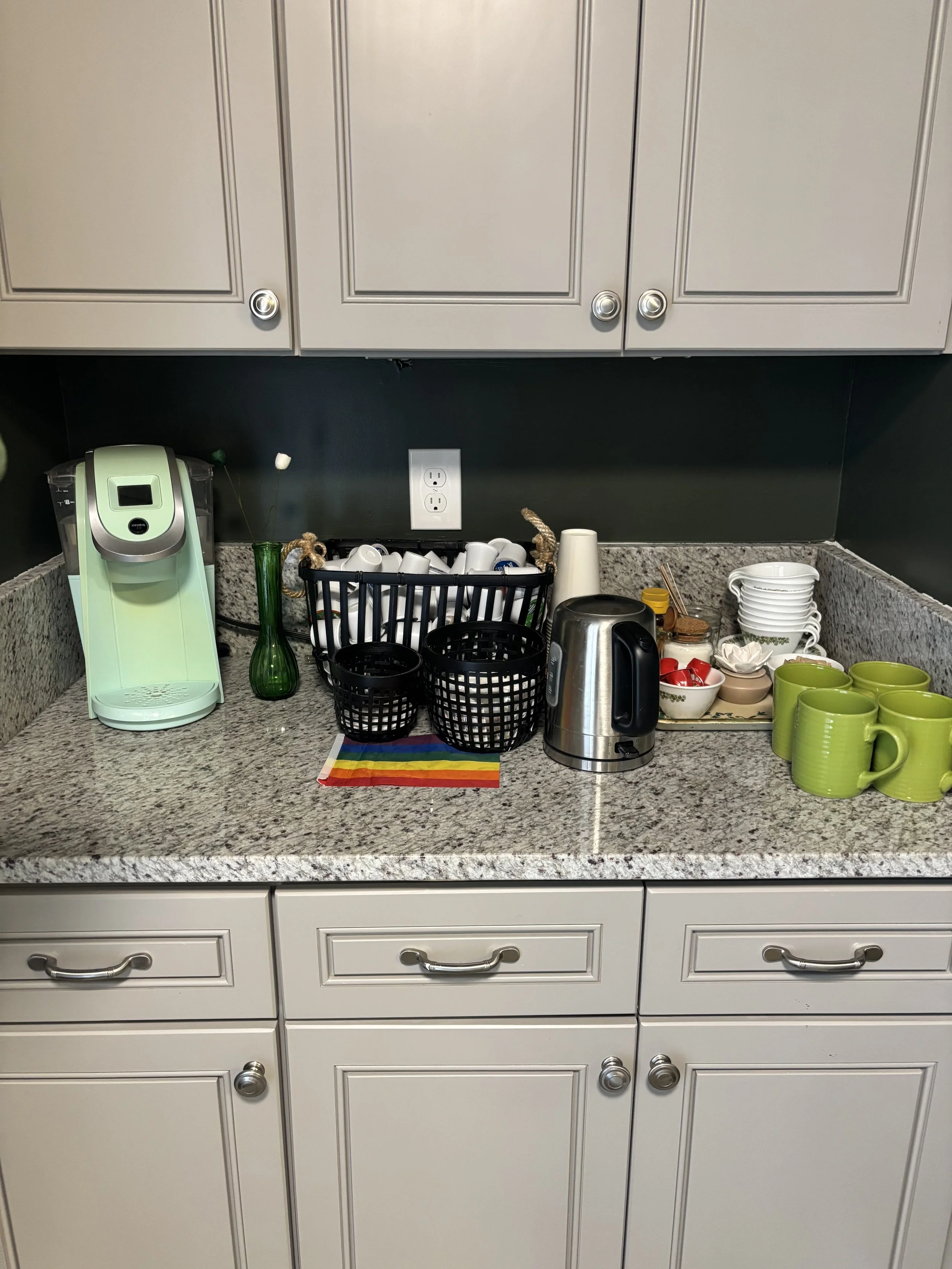 The coffee, tea, and hot chocolate bar is in a cozy nook near the crash pad. Feel welcome to access and enjoy as wanted.